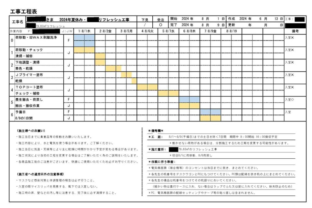 通常の工事ですと②-1ご提案書はなしですが、特殊工事(特殊床材や特殊工程など)ではしっかりとご提案書を作成しています。